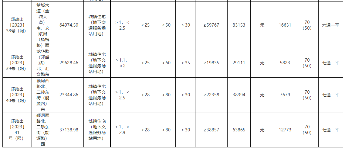 郑政出〔2023〕38号(网)地块位于金水区慧城大道(金城大道)南、文赋街(杨槐路)西;使用权面积64974.50平方米,土地用途为城镇住宅,容积率小于2.5,建筑高度小于50米。楼面价5119元/㎡,起始价为83153万元。