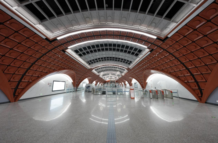 这座车站周边规划为居民住宅区,生活气息浓厚。站内公共区,是大跨无柱结构拱顶形式,弧形顶板结构看上去较为复杂,但很显品质。
