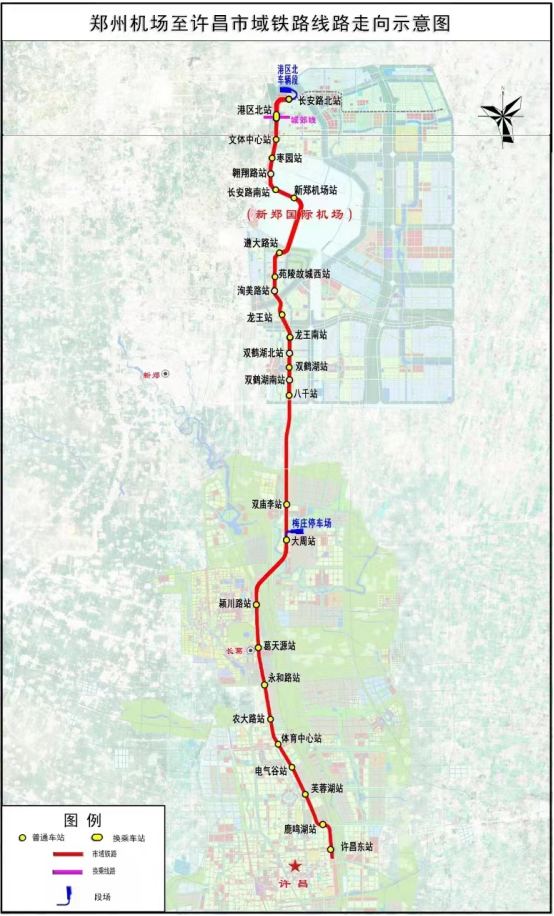 资料显示,郑许市域铁路北端起于郑州航空港区长安路北站,南端止于许昌市许昌东站,线路全长 67.13公里,共设车站 27 座。其中,郑州段 33.43公里,许昌段 33.7公里。全线换乘车站1座,在港区北站与城郊线换乘。