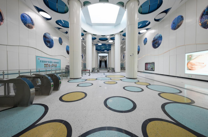 因而,车站在装修设计上,也特意提取双鹤湖的自然形态,通过简洁的形和意表达双鹤湖的生态特征,用彩色的自然水底窗口体现双鹤湖梦幻自然的美好意境。柱面镜面不锈钢反射出周围景色犹如湖面倒影层层叠叠,空间上打造空间一体化、艺术化设计,整体描绘出一幅自然生态和谐美丽的画卷。