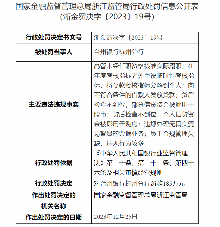 【大河财立方消息】1月3日,国家金融监督管理总局浙江监管局披露的行政处罚信息显示,台州银行杭州分行因高管未经核准实际履职等,被罚款185万元。这是监管部门公布的2024年首个银行业“高管未经核准实际履职”罚单。