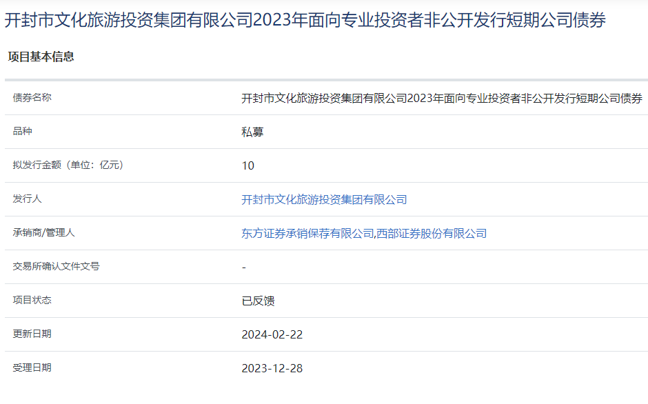 【大河财立方消息】2月22日,据上交所披露,开封市文化旅游投资集团有限公司2023年面向专业投资者非公开发行短期公司债券获上交所反馈。该债券拟发行金额10亿元,承销商/管理人为东方证券,西部证券。