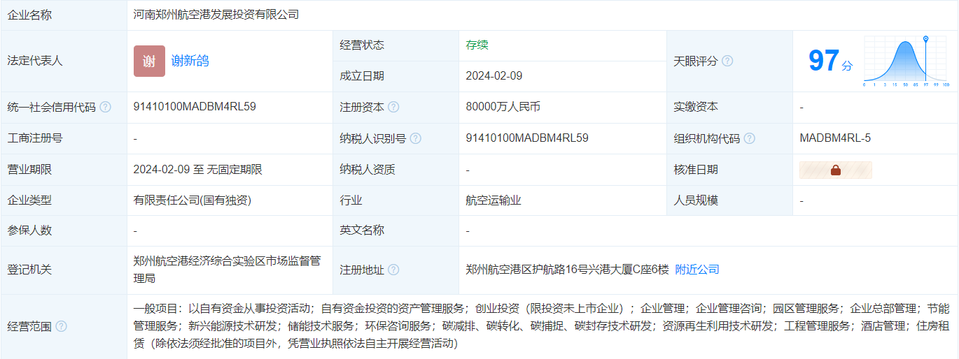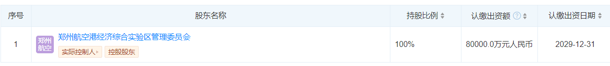 股权信息显示,该公司由郑州航空港经济综合实验区管理委员会100%出资设立。