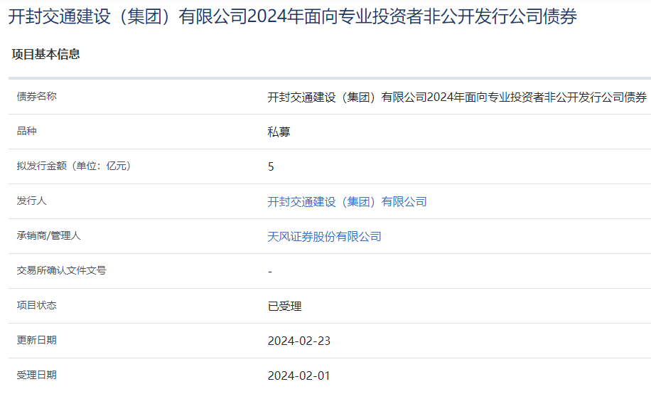 【大河财立方消息】2月23日,开封交通建设(集团)有限公司2024年面向专业投资者非公开发行公司债券获上交所受理。该债券拟发行金额5亿元,承销商/管理人为天风证券。