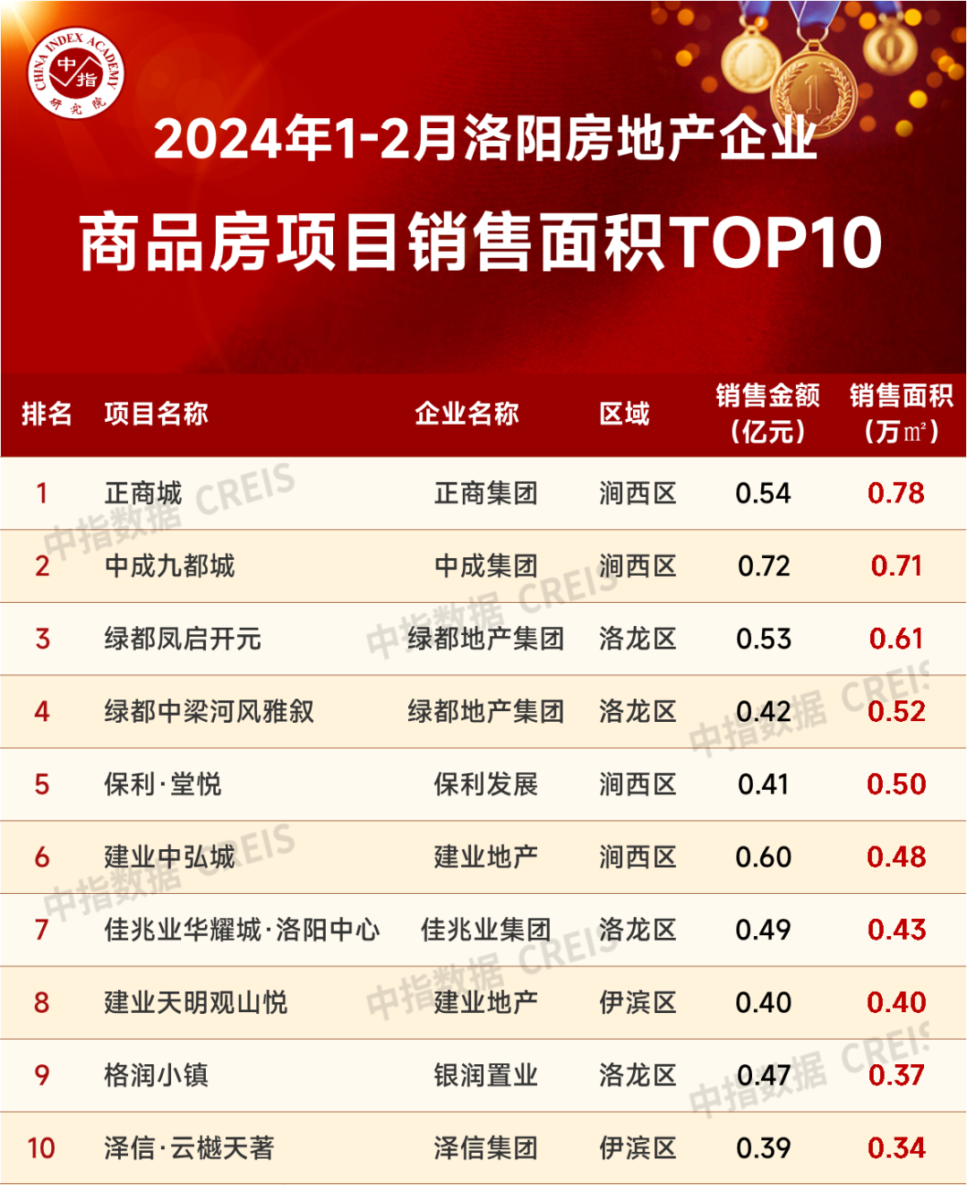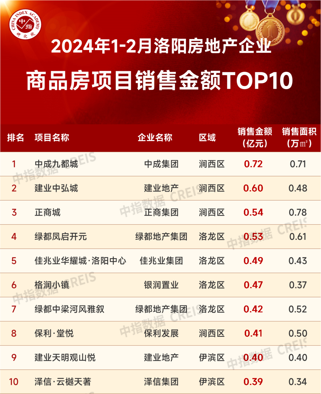 【大河财立方消息】3月9日,中指研究院发布2024年1-2月洛阳房地产企业销售业绩TOP10榜单。