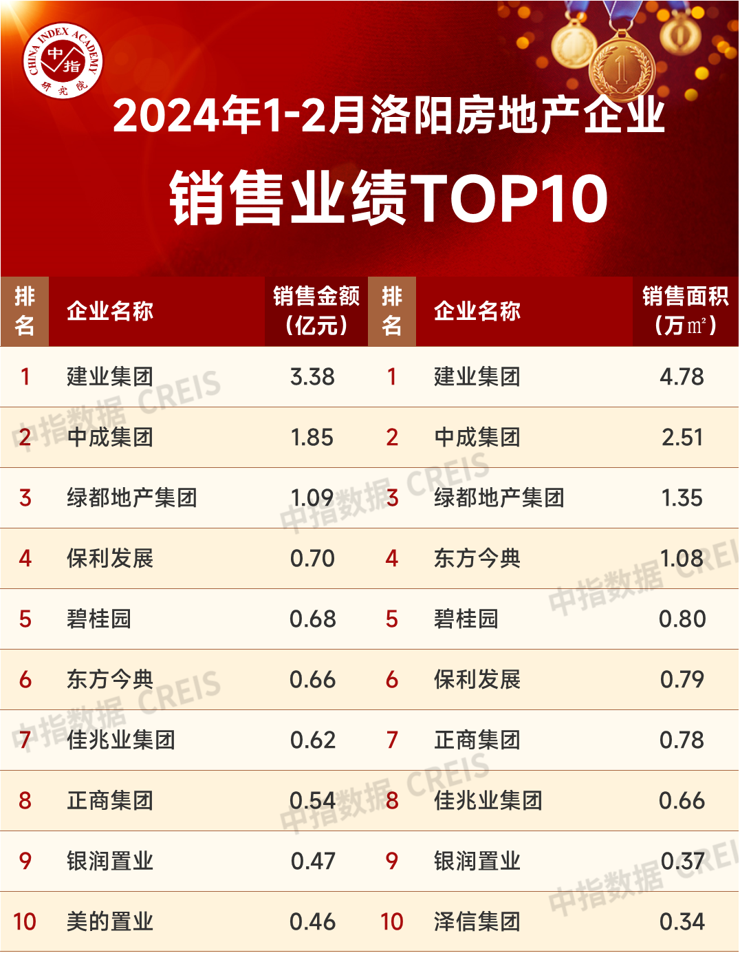 2024年1-2月,洛阳房地产销售金额TOP10企业合计销售金额为10.44亿元,销售面积TOP10企业合计销售面积13.45万平米。其中TOP10房企销售门槛值为0.46亿元/0.34万平米。