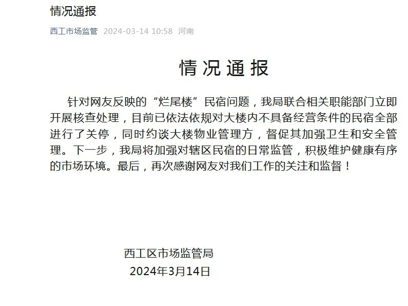 针对网友反映的“烂尾楼”民宿问题,西工区市场监管局联合相关职能部门立即开展核查处理,目前已依法依规对大楼内不具备经营条件的民宿全部进行了关停,同时约谈大楼物业管理方,督促其加强卫生和安全管理。