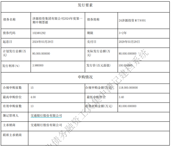 【大河财立方消息】3月29日,济源投资集团有限公司披露2024年度第一期中期票据发行情况。