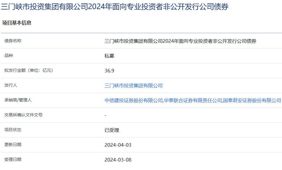 【大河财立方消息】4月3日,三门峡市投资集团有限公司2024年面向专业投资者非公开发行公司债券项目获上交所受理。