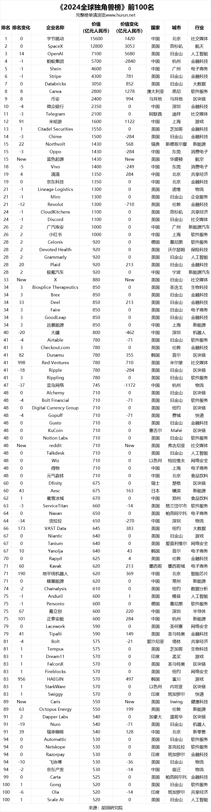 【大河财立方消息】4月9日,胡润研究院发布《2024全球独角兽榜》,列出了全球成立于2000年之后,价值10亿美元以上的非上市公司。中国4家独角兽进入前十,其中,字节跳动以价值1.56万亿元,继续位列排行榜第一。