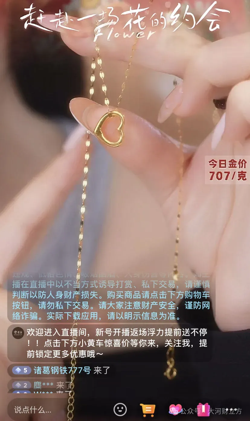 除了线下业务,不少黄金品牌布局了线上平台。直播间内主播熟练的话术加上柔和的灯光,气氛渲染到位,价位从几百元到几千元不等。但黄金不同于其他消费品,其“贵重”的本质让人们在购买时更加慎重,因在线上无法感受实物的重量和质感,让部分消费者望而却步。