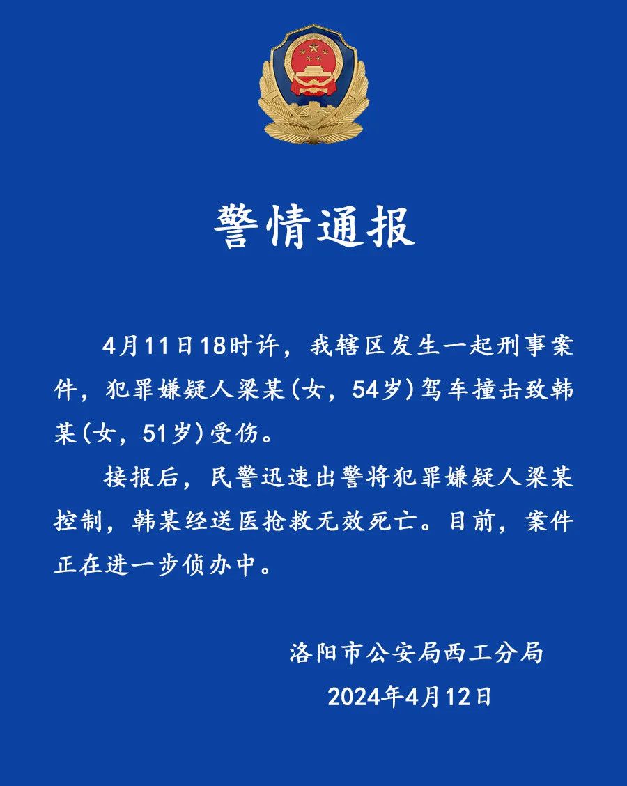 中新网4月12日电 洛阳市公安局西工分局4月12日发布警情通报称,4月11日18时许,该辖区发生一起刑事案件,犯罪嫌疑人梁某(女,54岁)驾车撞击致韩某(女,51岁)受伤。接报后,民警迅速出警将犯罪嫌疑人梁某控制,韩某经送医抢救无效死亡。目前,案件正在进一步侦办中。