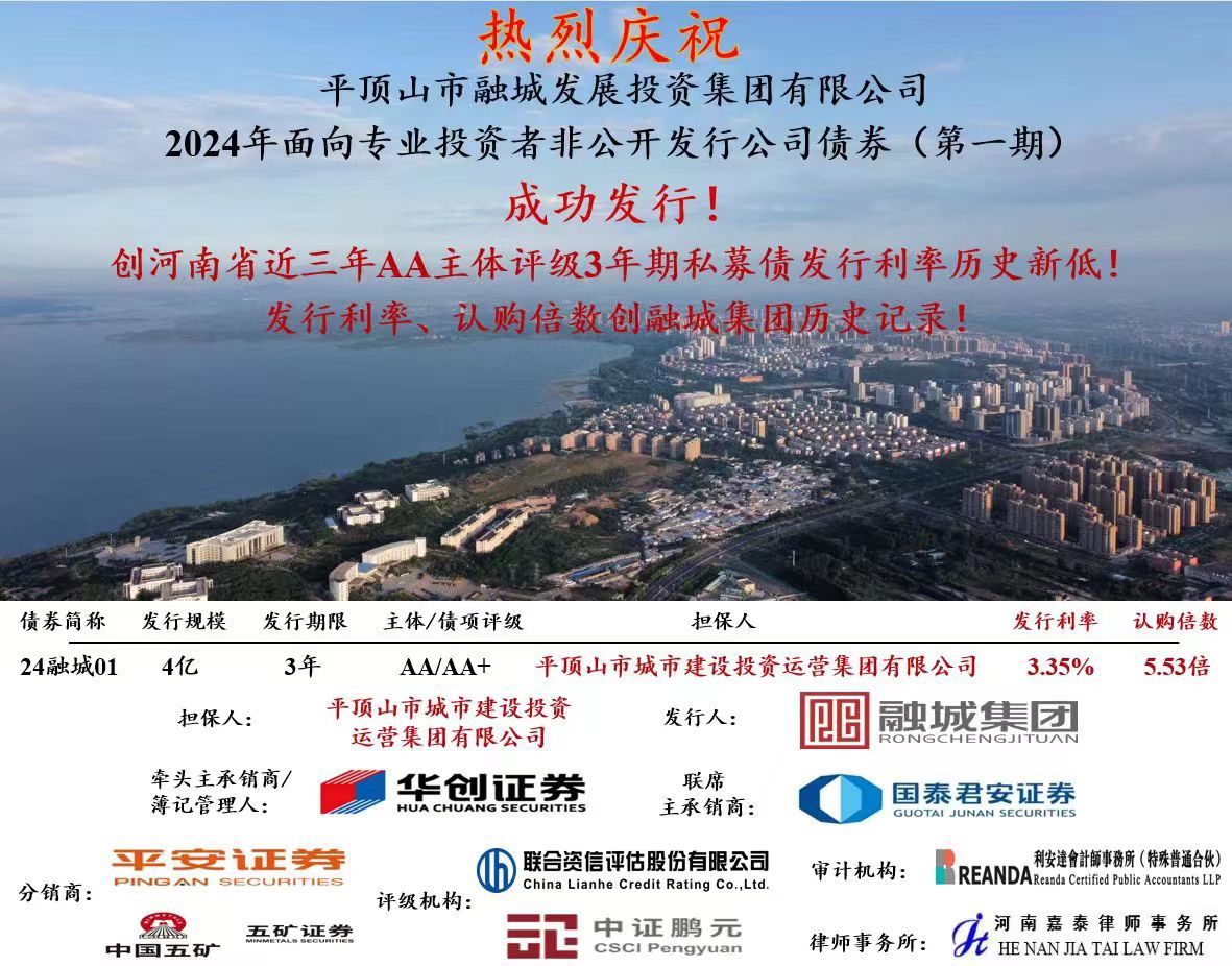 【大河财立方消息】4月15日消息,平顶山市融城发展投资集团有限公司2024年面向专业投资者非公开发行公司债券(第一期)日前已完成发行。
