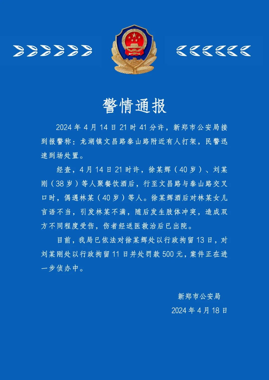 警方早前发布的通报指出,2024年4月14日21时41分许,新郑市公安局接到报警称:龙湖镇文昌路泰山路附近有人打架,民警迅速到场处置。