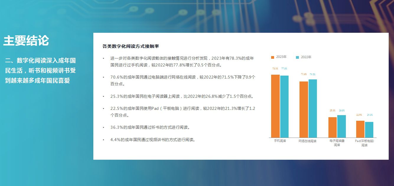进一步对各类数字化阅读载体的接触情况进行分析发现,2023年有78.3%的成年国民进行过手机阅读,较2022年的77.8%增长了0.5个百分点;70.6%的成年国民通过电脑端进行网络在线阅读,较2022年的71.5%下降了0.9个百分点。