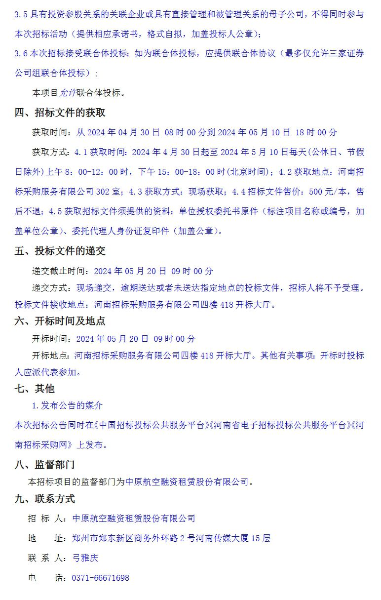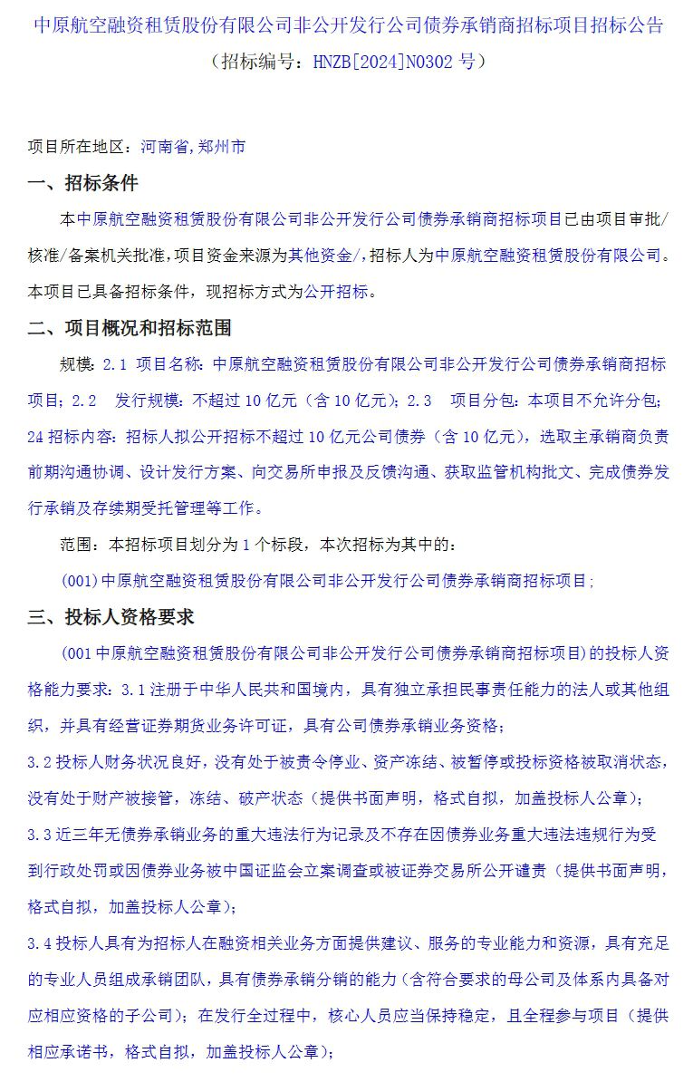 【大河财立方消息】4月29日,中原航空融资租赁股份有限公司公告,拟发行不超过10亿元公司债券(含10亿元),选取主承销商负责前期沟通协调、设计发行方案、向交易所申报及反馈沟通、获取监管机构批文、完成债券发行承销及存续期受托管理等工作。开标时间为5月20日。