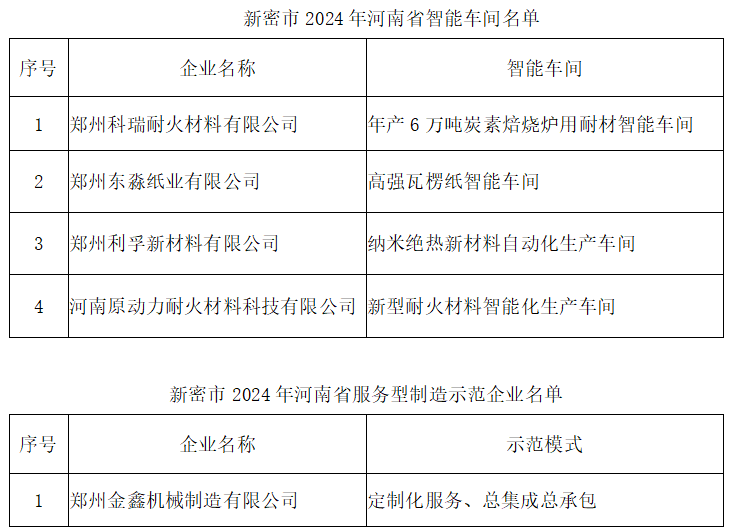 新增的4个河南省智能车间分别是郑州科瑞耐火材料有限公司年产6万吨炭素焙烧炉用耐材智能车间、郑州东淼纸业有限公司高强瓦楞纸智能车间、郑州利孚新材料有限公司纳米绝热新材料自动化生产车间、河南原动力耐火材料科技有限公司新型耐火材料智能化生产车间。郑州金鑫机械制造有限公司定制化服务、总集成总承包的示范模式获评2024年服务型制造示范企业。