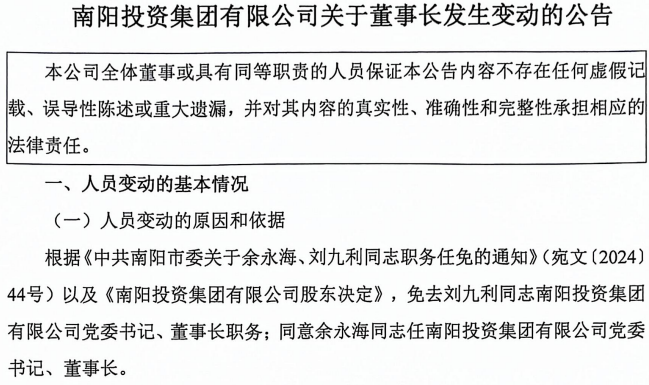 【大河财立方消息】5月20日消息,南阳投资集团日前发布公告称,根据《中共南阳市委关于余永海、刘九利同志职务任免的通知》以及《南阳投资集团有限公司股东决定》,免去刘九利南阳投资集团党委书记、董事长职务;同意余永海任南阳投资集团党委书记、董事长。