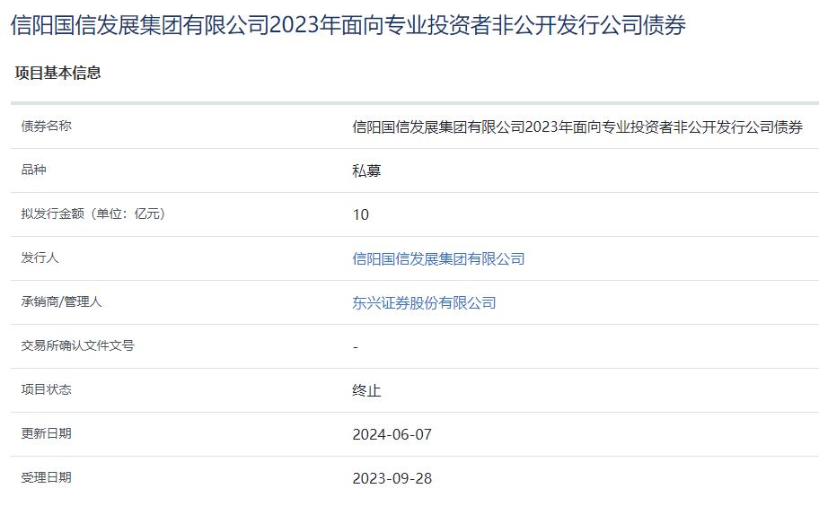 【大河财立方消息】6月7日,信阳国信发展集团有限公司2023年面向专业投资者非公开发行公司债券项目已被上交所终止。