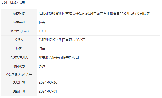 【大河财立方消息】7月2日消息,信阳建投投资集团有限责任公司2024年面向专业投资者非公开发行公司债券项目获深交所通过。