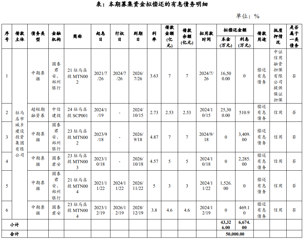 本期债券简称“24驻马店投MTN003”,发行规模5亿元,利率2.65%,期限5年;债券起息日为2024年7月3日,兑付日为2029年7月3日;债券牵头主承销商/簿记管理人/存续期管理机构为国泰君安证券,联席主承销商为平安证券。经大公国际综合评定,发行人主体信用评级为AA+,评级展望为稳定。