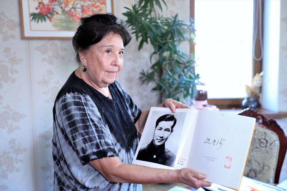 2021年5月21日,拜卡达莫娃在阿拉木图家中展示与冼星海有关的书籍。