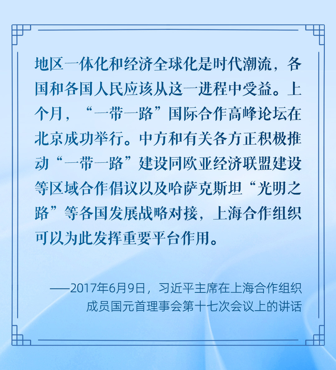 上海合作组织与“一带一路”建设存在天然“亲缘”关系。2013年,习近平主席出访哈萨克斯坦,在纳扎尔巴耶夫大学提出共同建设“丝绸之路经济带”。十几年来,上海合作组织一直在“一带一路”建设中发挥重要平台作用。“一带一路”建设的设施建设、贸易往来,也为上海合作组织区域经贸合作提速激活了强劲引擎。两者交相辉映,共筑经济繁荣之路。
