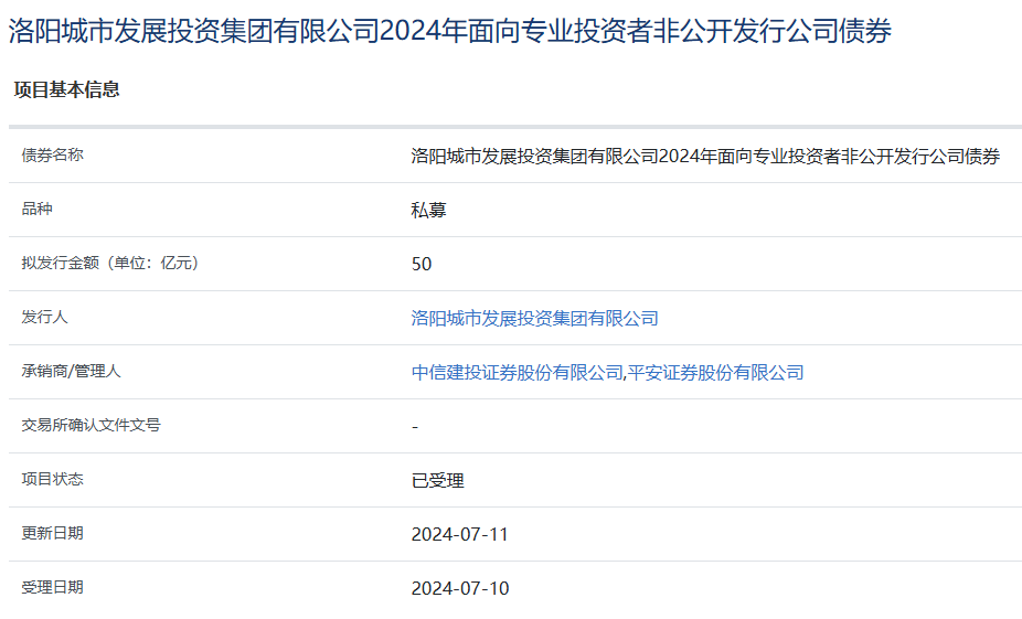 【大河财立方消息】7月11日,洛阳城市发展投资集团有限公司2024年面向专业投资者非公开发行公司债券项目获上交所受理。
