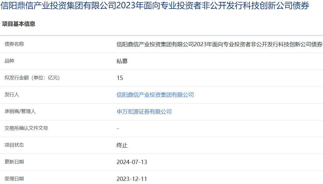 【大河财立方消息】7月13日,信阳鼎信产业投资集团有限公司2023年面向专业投资者非公开发行科技创新公司债券项目状态更新为终止。该债券拟发行金额15亿元,品种为私募,承销商/管理人为申万宏源证券,受理日期为2023年12月11日。2023年7月24日,东方金诚给予发行人AA主体信用评级,评级展望为稳定。