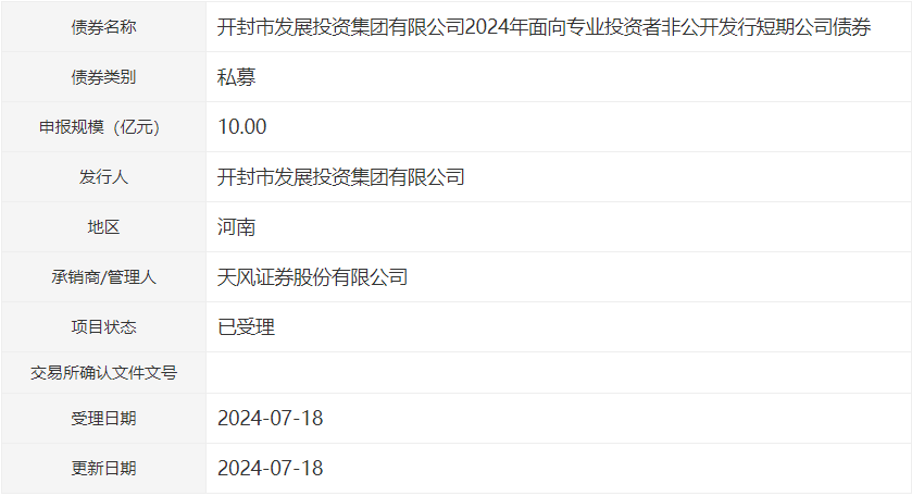 【大河财立方消息】7月18日,开封市发展投资集团有限公司2024年面向专业投资者非公开发行短期公司债券项目,获深交所受理。