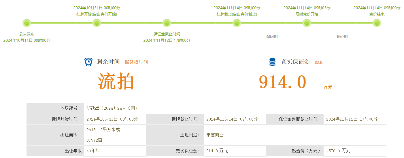 【大河财立方消息】11月14日,郑州市公共资源交易中心消息,郑政出〔2024〕24号(网)地块流拍。
