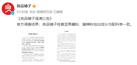 【大河财立方消息】11月19日凌晨,良品铺子发布澄清公告称,2024年11月18日,湖北省武汉市东西湖区市场监督管理局发布情况通报:结合两地(安徽、河南)市场监管部门协查回函以及武汉市东西湖区市场监督管理局调查情况,举报人反映的良品铺子涉嫌委托生产的“‘桂香坚果藕粉’检测出木薯成分",“酸辣粉’未检测出红薯成分”的问题并不成立。