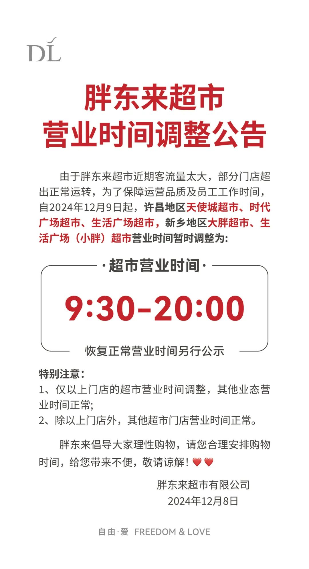 【大河财立方 记者 杨霄 实习生 陈星冉】12月9日,胖东来公司发布消息称,自该日起,其在许昌、新乡经营的4家主力店将在每晚8点停止营业,其他门店照秋冬时间表正常营业。