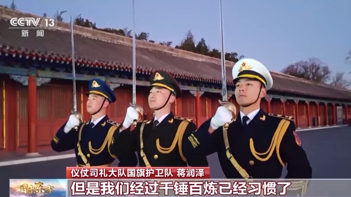 仪仗司礼大队国旗护卫队蒋润泽:我们三名分队长刀柄、刀鞘都要一致,手一僵动作会变形,但是我们经过千锤百炼已经习惯了,再冷我们也会把动作做完全。
