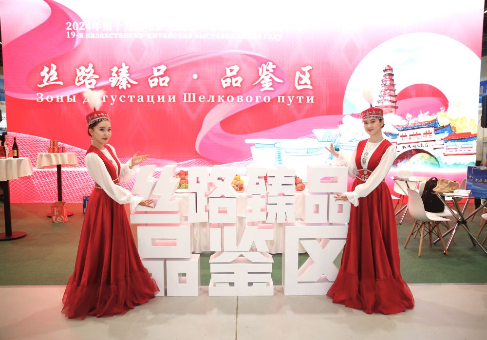 2024年8月23日,在哈萨克斯坦阿斯塔纳,身着民族服饰的工作人员在第十九届哈萨克斯坦—中国商品展览会上欢迎观展民众。新华社发(奥斯帕诺夫摄)