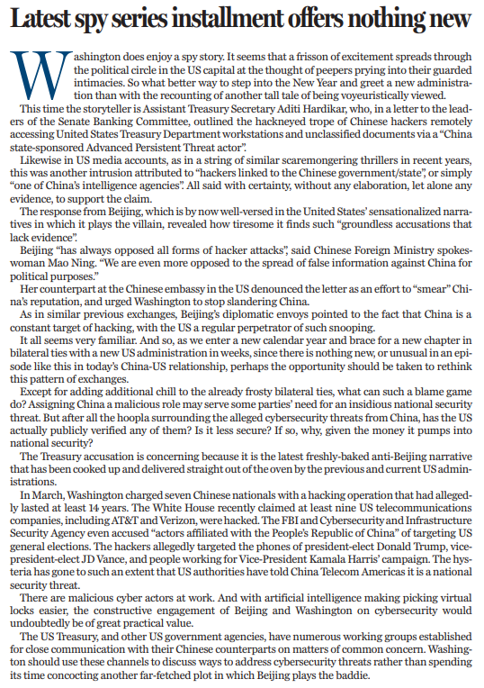 美国财政部的指控令人担忧,这是美国政府炮制的最新反华言论。美国的无端指控缺乏证据,令人厌倦。中国外交部发言人毛宁表示,中方一贯反对各种形式的黑客攻击,更反对出于政治目的散布针对中国的虚假信息。