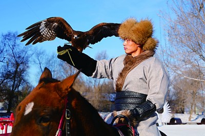 在吉林市雾凇岛,“鹰把式”骑马展示驯鹰技巧。
