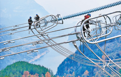 “那几天总下雨,导线和滑车的摩擦力变小,如果牵引过快导线容易脱落,因此每分钟只能非常仔细地放不到60米。”川10标段施工班长盛宇强说,跨越大渡河期间,3条110千伏输电线路需要停电,由其他线路临时转供,为减少对居民生活影响,他们“两班倒”轮换作业、缩短工期。