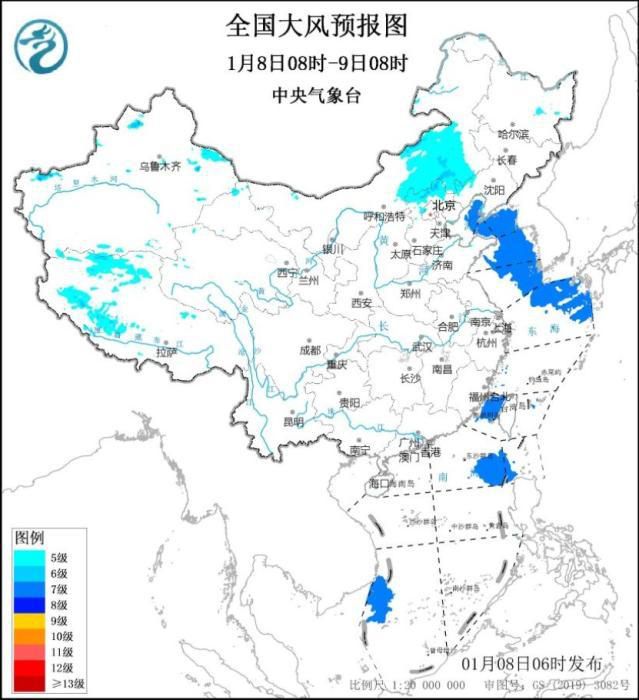 受冷空气影响,8日至9日,中东部大部及新疆北部、青藏高原东部等地将有4~6℃降温,局地降温8℃以上。8日08时至9日08时,内蒙古中东部、河北北部、辽宁西北部及西藏中西部等地部分地区将有5~6级、阵风7~8级的大风;渤海、渤海海峡、黄海大部海域、东海东北部海域、台湾海峡、南海东北部和西南部偏西海域、巴士海峡偏西海域将有7级、阵风8~9级的偏北到东北风(见图1)。中央气象台1月8日06时继续发布大风蓝色预警。