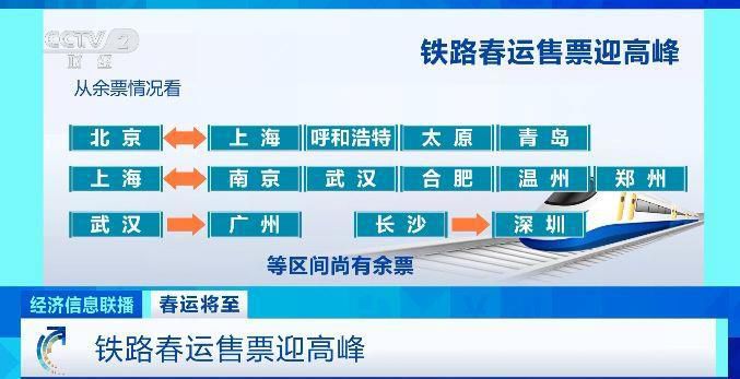 从余票情况看,北京往返上海、呼和浩特、太原、青岛,上海往返南京、武汉、合肥、温州、郑州,武汉至广州、长沙至深圳等区间尚有余票;京津冀、沪宁杭、广深港、成渝等地区城际列车余票充足。