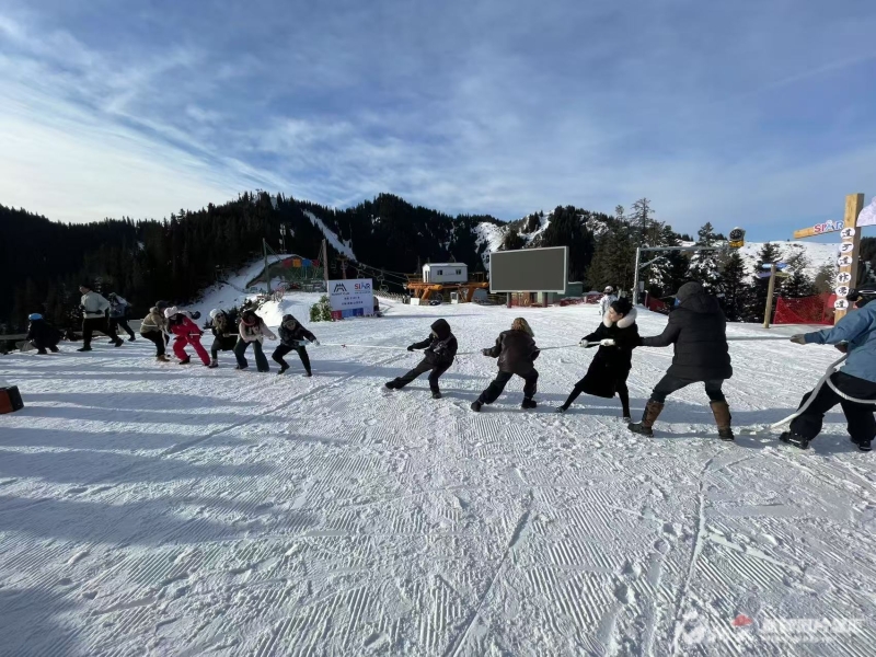 中外博主在丝绸之路山地度假区拔河。石榴云/新疆日报记者 姚刚摄