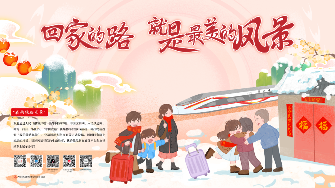 欢迎你在人民日报客户端、新华网客户端、中国文明网、人民铁道网、微博、抖音、小红书、“中国铁路”新媒体平台参与活动,通过扫码(见海报下侧)或搜索“我的铁路风景”,登录网站专题页面等方式投稿,晒晒回家路上流动的风景,讲述风景背后的生动故事,优秀作品将在媒体平台和高铁站车上展示分享!