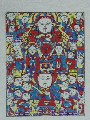△ 山东杨家埠年画《灶王》,上为增福财神,中为灶王与灶王奶奶坐于灶王府中,下为灶王坐堂,办理公事。中国农业博物馆藏