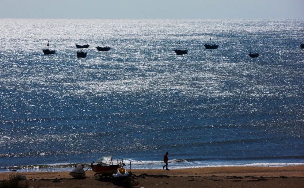 一名男子走在觉华岛的沙滩上。新华社记者 郭求达 摄