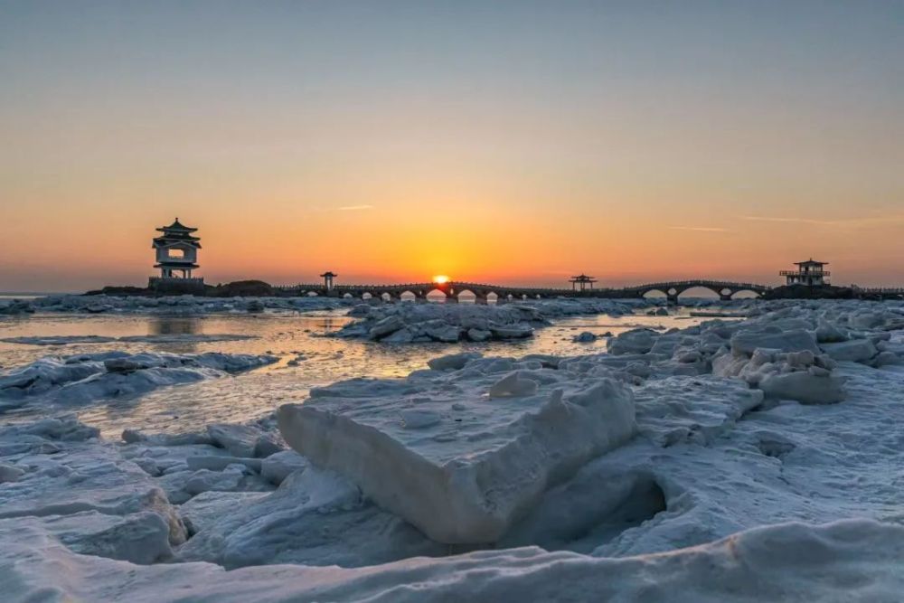 数九隆冬,位于葫芦岛兴城市的三礁揽胜景区附近海水结冰。