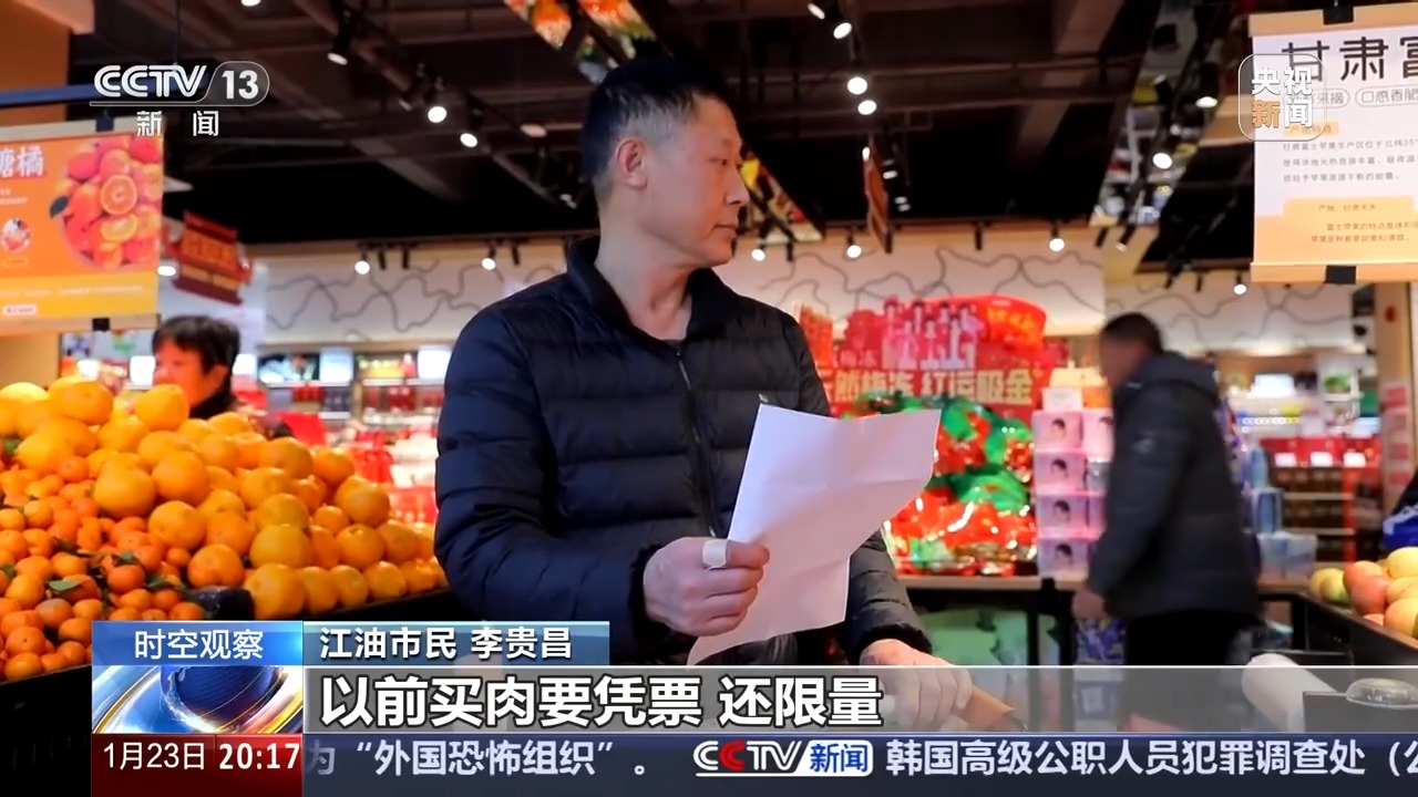 江油市民李贵昌:今天来买点肉、水果、零食之类的,以前买肉要凭票,还限量,现在想买多少就是多少。