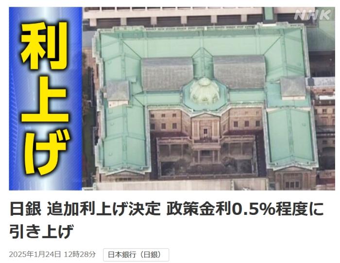 中新网1月24日电 据日本广播协会(NHK)报道,日本央行在24日结束的货币政策决策会议上,决定将政策利率提升至约0.5%,创17年来新高。
