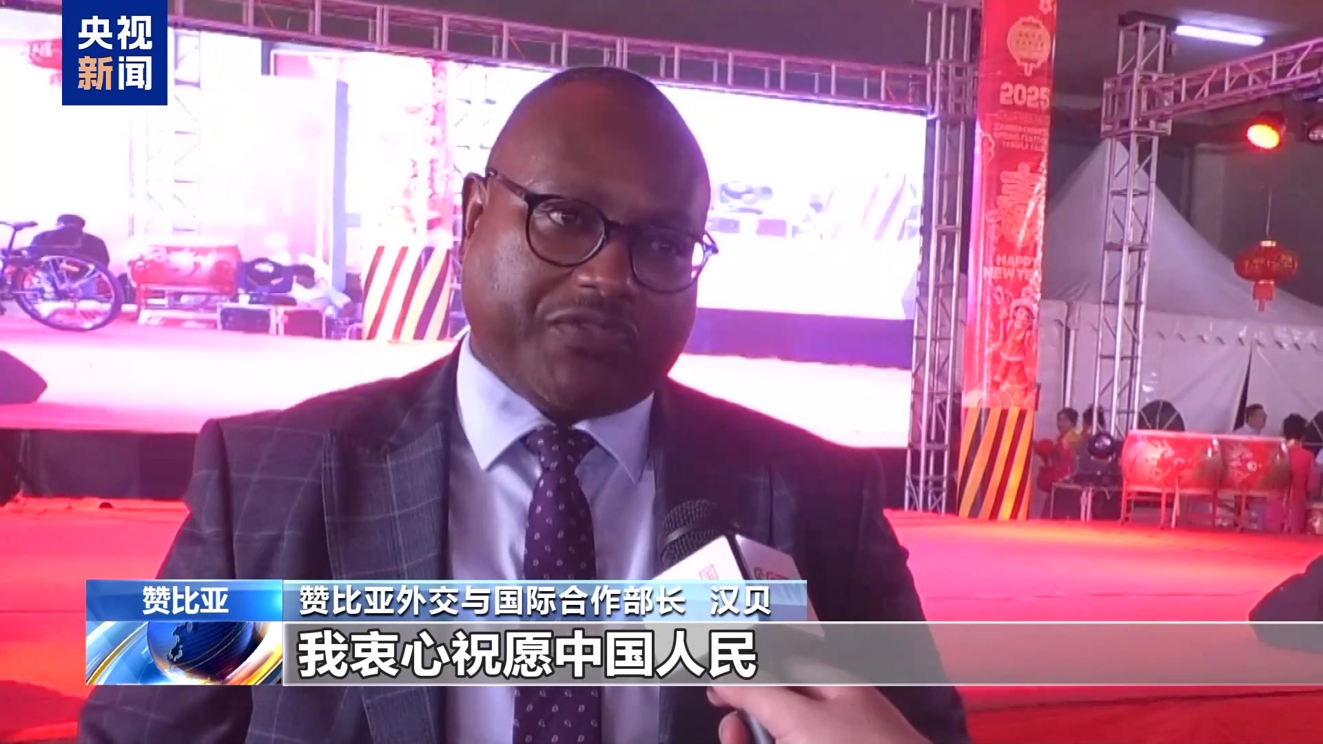 赞比亚外交与国际合作部长汉贝:我衷心祝愿中国人民在新的一年里繁荣富裕,充满喜乐。请允许我用中文送上我的美好祝福,新年快乐。