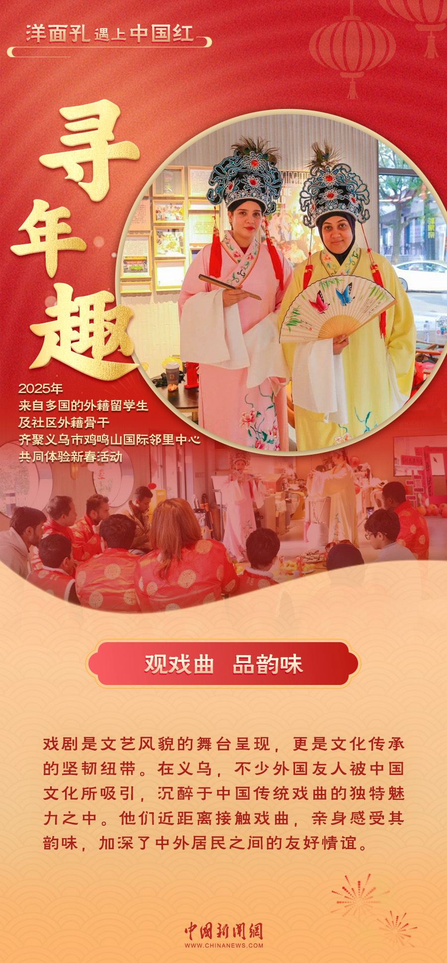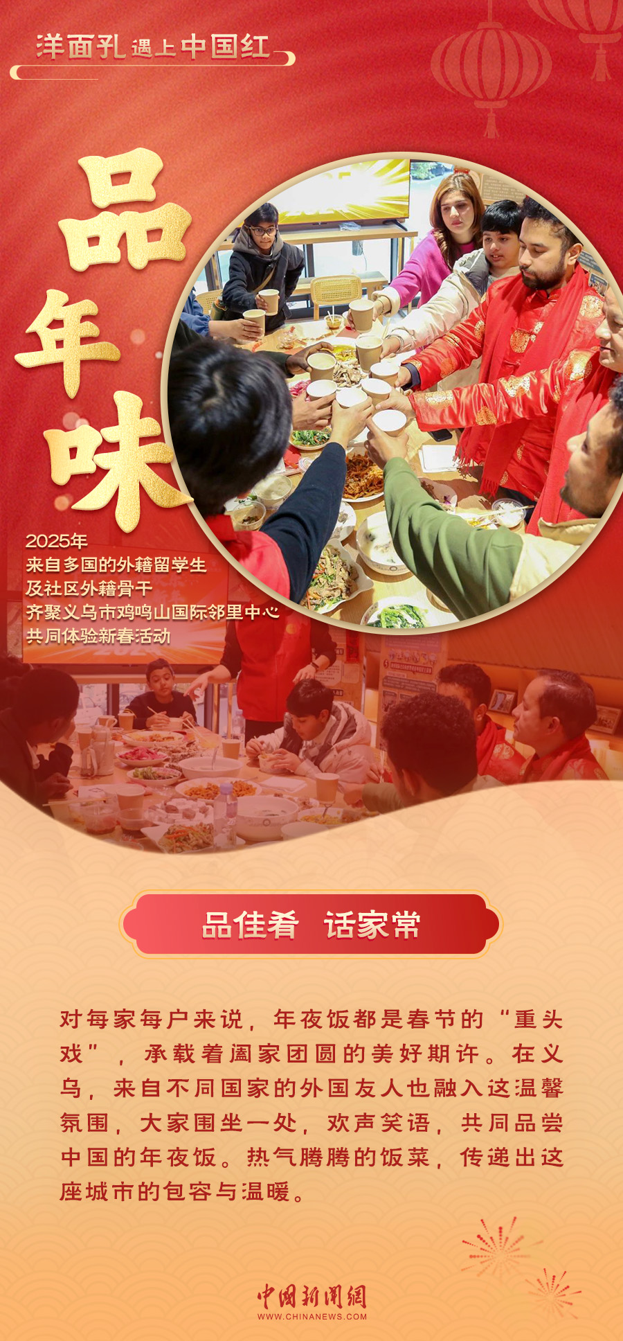 当“洋面孔”遇上“中国红”,一场跨越文化的交融在义乌上演。红火的对联、热闹的戏剧表演、香甜的年夜饭……外国友人们沉浸在中国年的喜庆氛围中,感受着这份独特的温暖与欢乐。义乌的年味,不仅温暖了“世界老乡”的心,也让全球各个地方看到了中国年的魅力与温度。