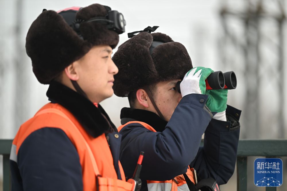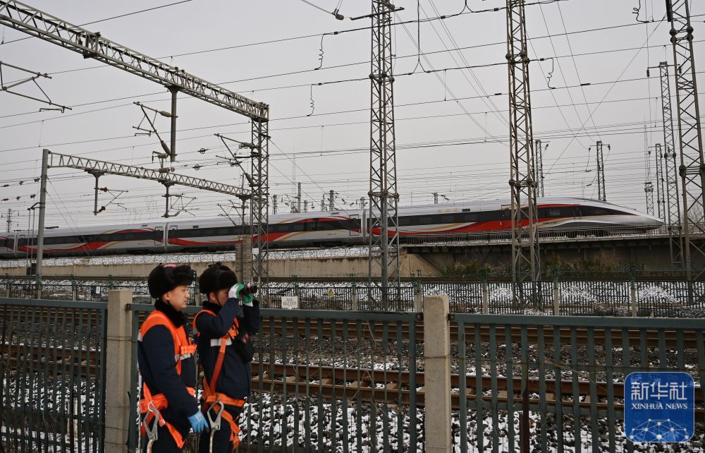 寒潮来袭,中国铁路北京局集团有限公司天津供电段供电维修车间组织应急抢险人员上岗待命,在雪后对铁道上方的接触网运行状态进行巡视,确保春运期间供电设备安全运行。